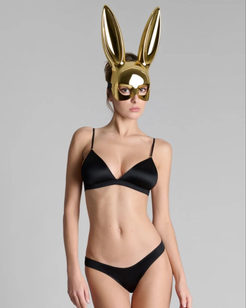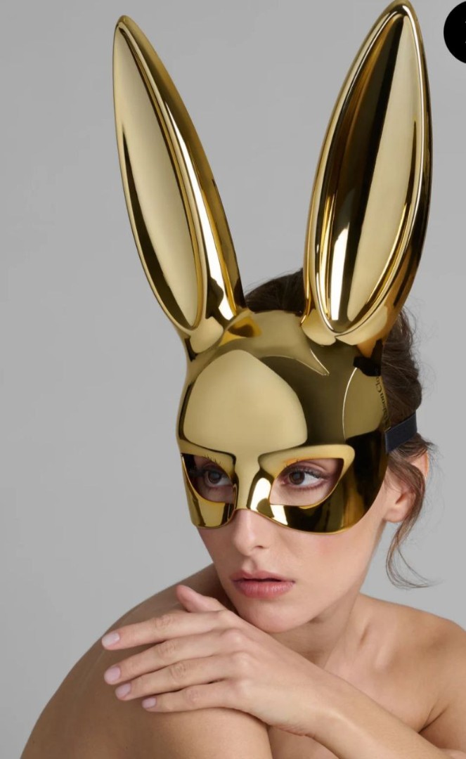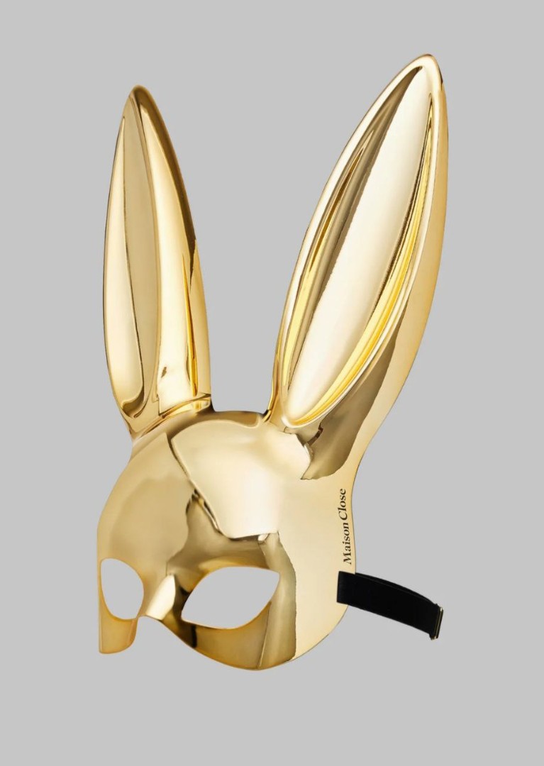 Золотая маска кролика от Maison Close - стильный аксессуар, сочетающий смелость и элегантность. Гладкая поверхность играет со светом, делая образ эффектным.