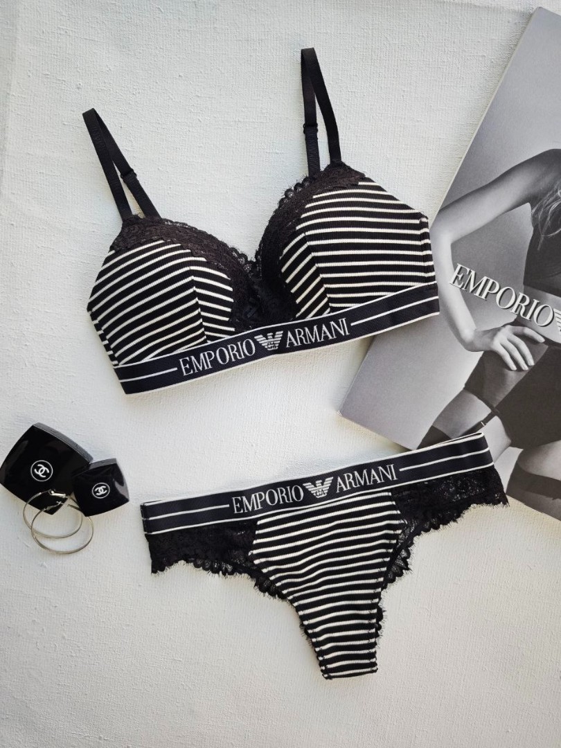 Купить черный в белую полоску или белый бюстгальтер и трусики бразилиана Armani можно всего в пару кликов на Juliette с доставкой в Ужгород, Одессу, Харьков, Киев и другие города Украины.