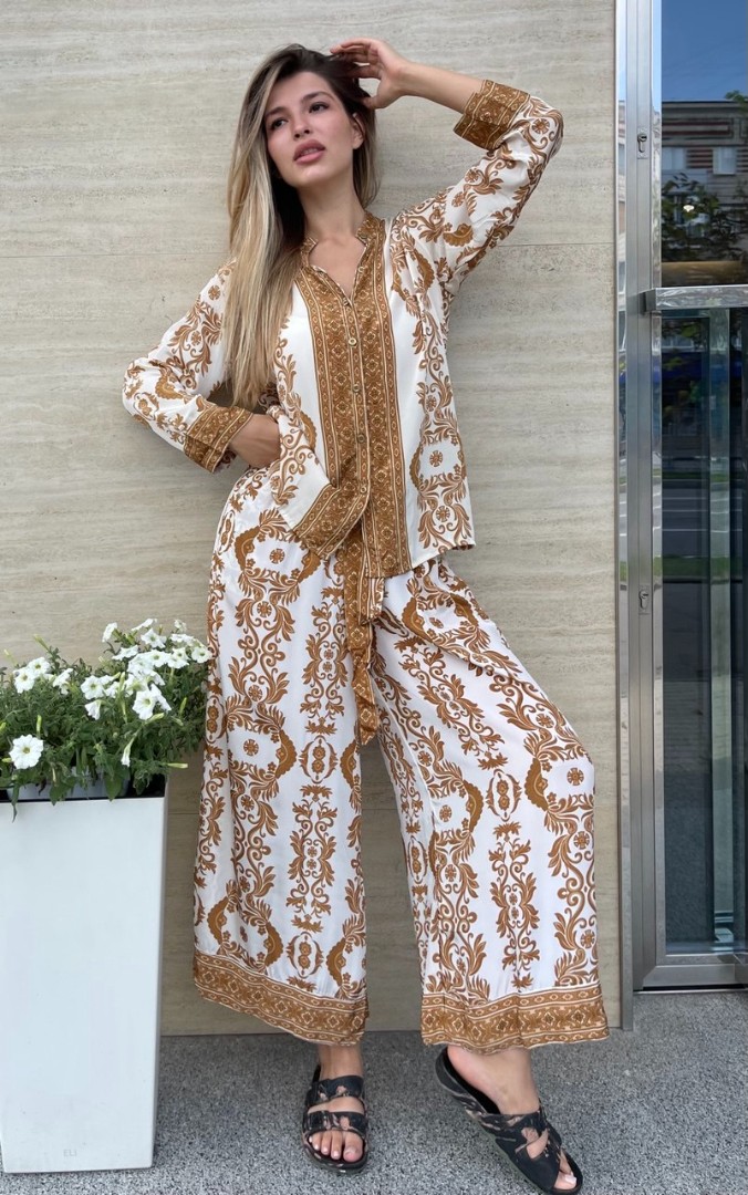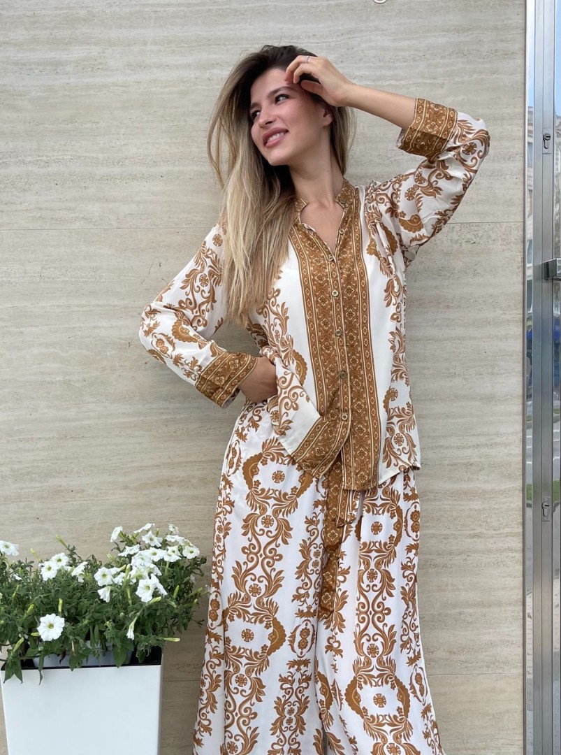 Элегантный комплект Pahiesa Formentera - шелковая рубашка и брюки-палаццо. Глубокий коричнево-бежевый принт вносит динамику, оставаясь при этом универсальным для повседневных и вечерних сочетаний.
