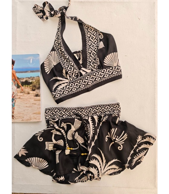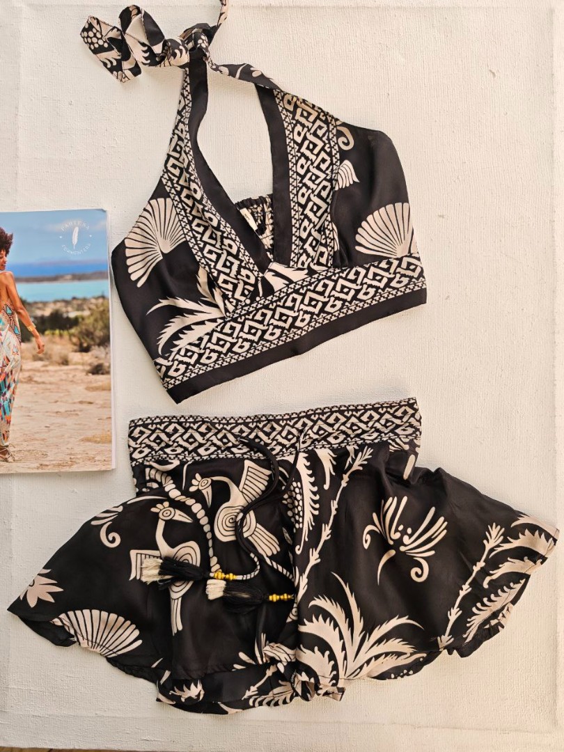 Костюм топ халтер и шорты - это модель, в которой гладь шелка и авторский принт сливаются в образ, который завораживает с первого взгляда. Итальянский бренд Pahiesa Formentera мастерски сочетает в своих моделях чувственность и взрывную энергию.