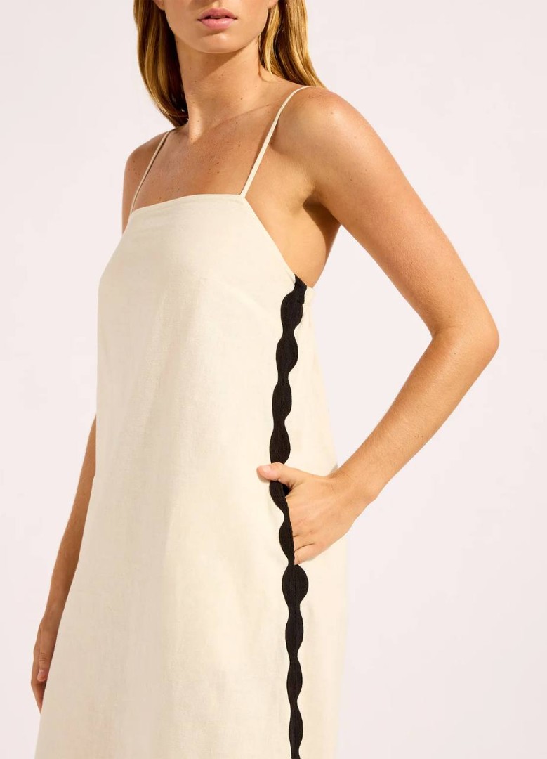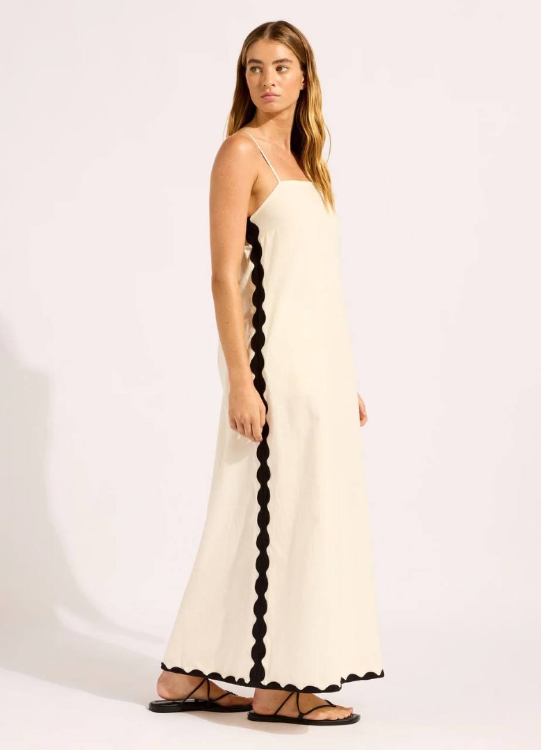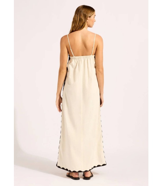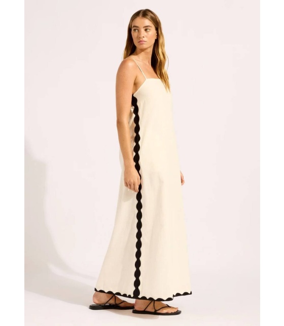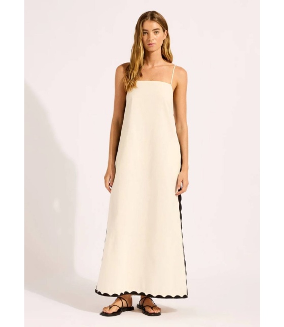 Платье макси Seafolly из смеси хлопка и льна. Модель без рукавов подчеркивает естественность силуэта, а регулируемые бретели позволяют подстроить посадку под индивидуальные параметры.
