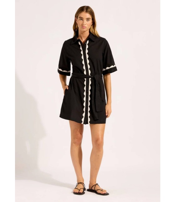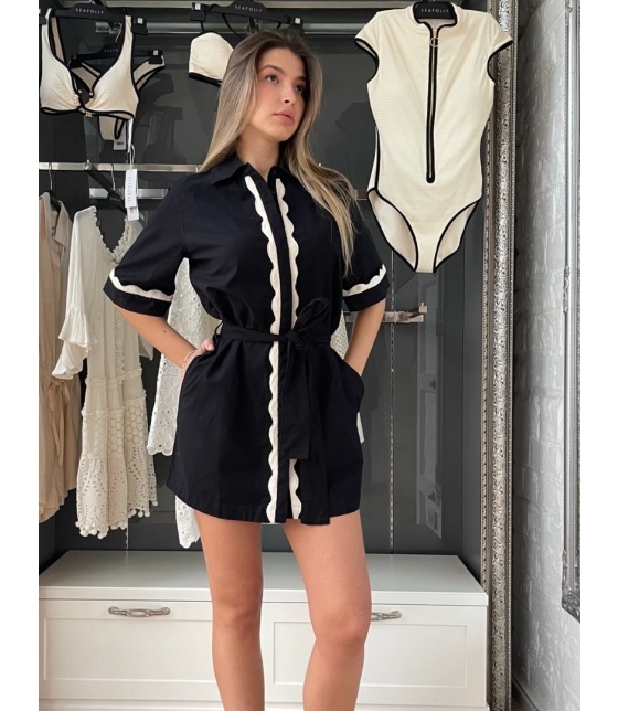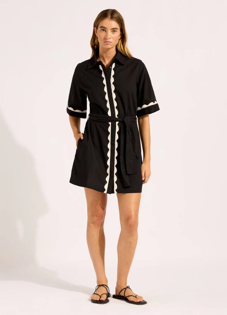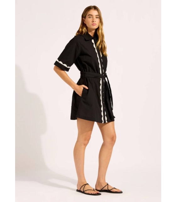 Элегантное миди-платье Seafolly в насыщенном черном цвете гармонично сочетает классическую строгость и смелые дизайнерские акценты. Особое внимание привлекает изящный пояс, который подчеркивает талию, а контрастная белая отделка по всему платью добавляет образу свежести.