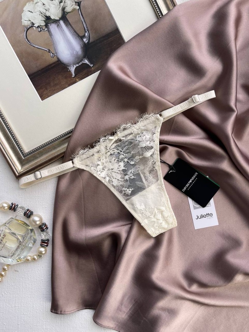 Кружевные стринги от легендарного итальянского бренда Emporio Armani. Средняя линия посадки подчеркивает изгибы бедер, обеспечивая соблазнительный силуэт.