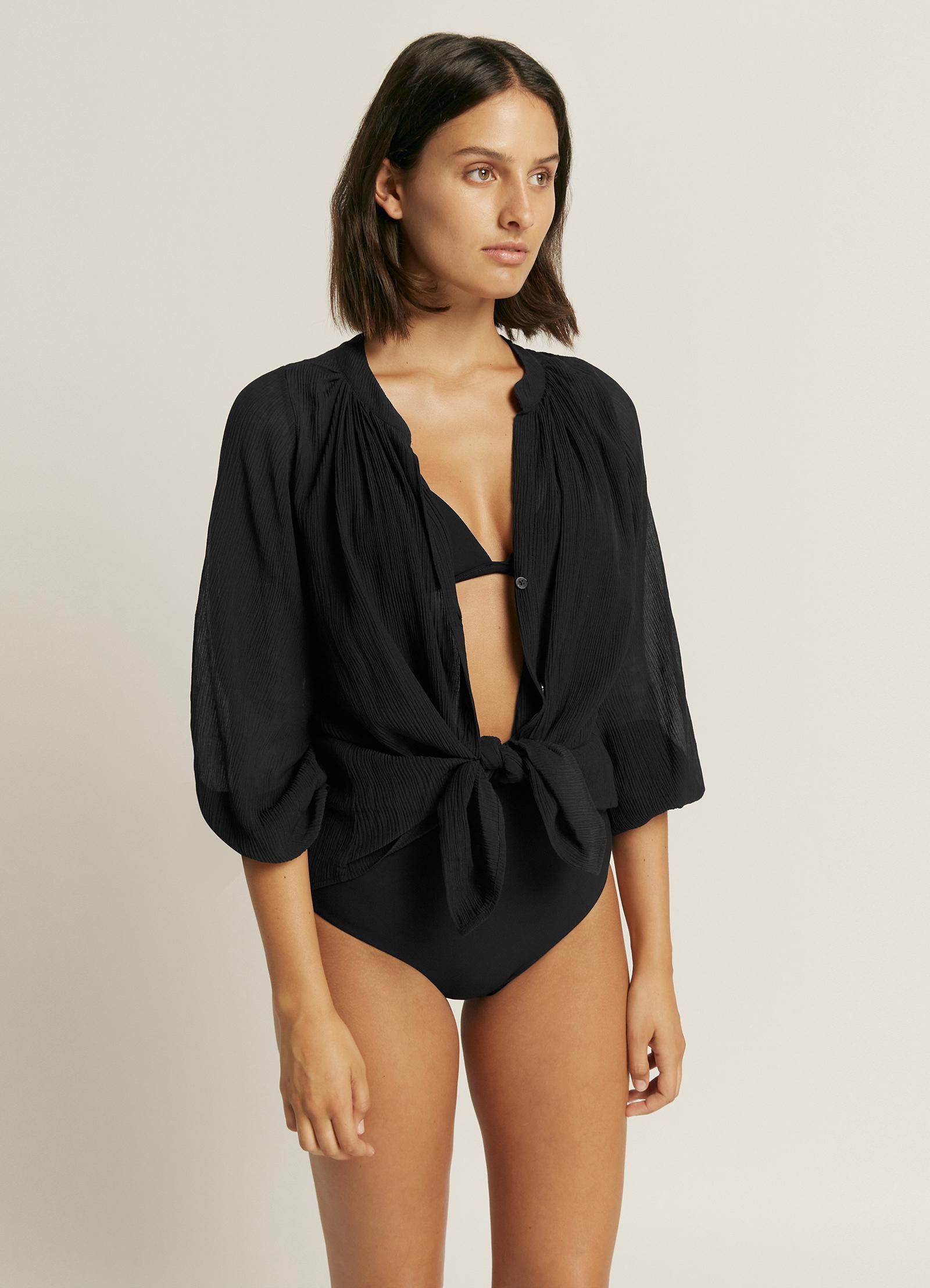 Стильная рубашка австралийского бренда Jets - новинка из коллекции 2021 года. Ткань состоит из хлопка 82% и шелка 18%. Материал - легкая жатка. Темно-синий, черный и белый цвета рубашки в наличии. Спереди пуговицы, есть небольшой воротник. Рукав короткой рубашки - до запястий, на резинке в нижней части. Рубашку можно носить в комплекте с купальником или использовать, как часть городского лука, в комплекте, например, с льняными или джинсовыми шортами.