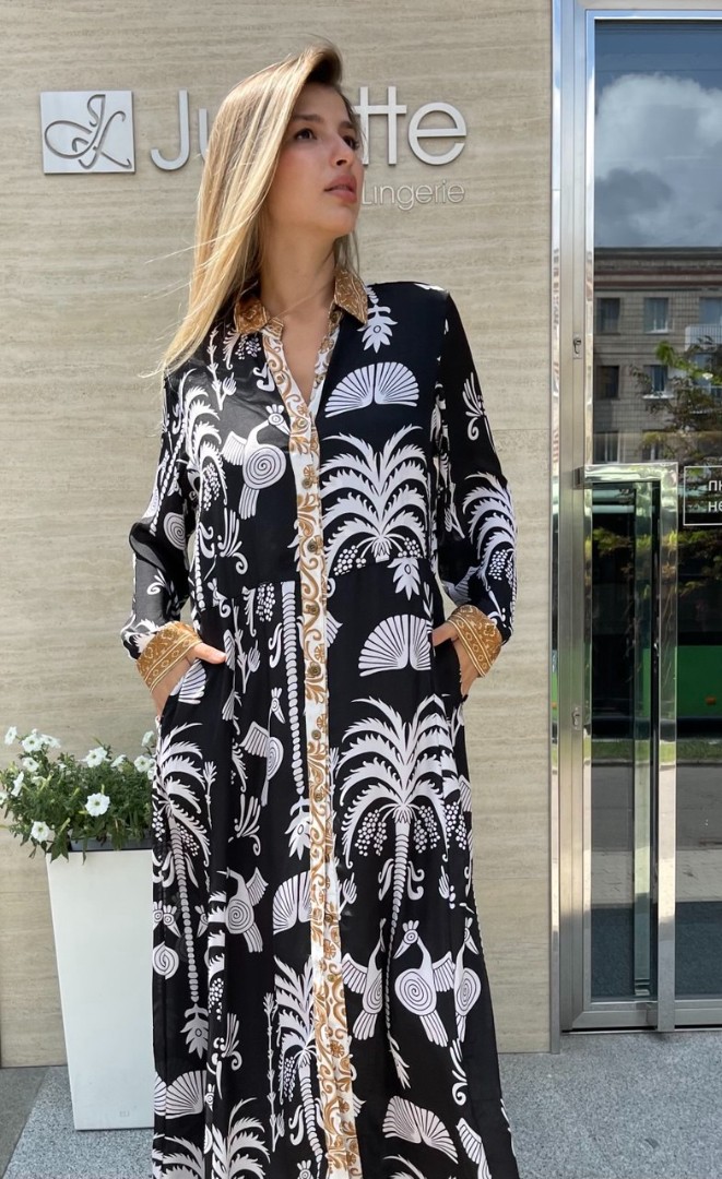 Довга сукня від відомого італійського бренду Pahiesa Formentera з набивного шовку. Модель поєднує у собі легкість і благородну текстуру, що м'яко струмує при кожному русі.