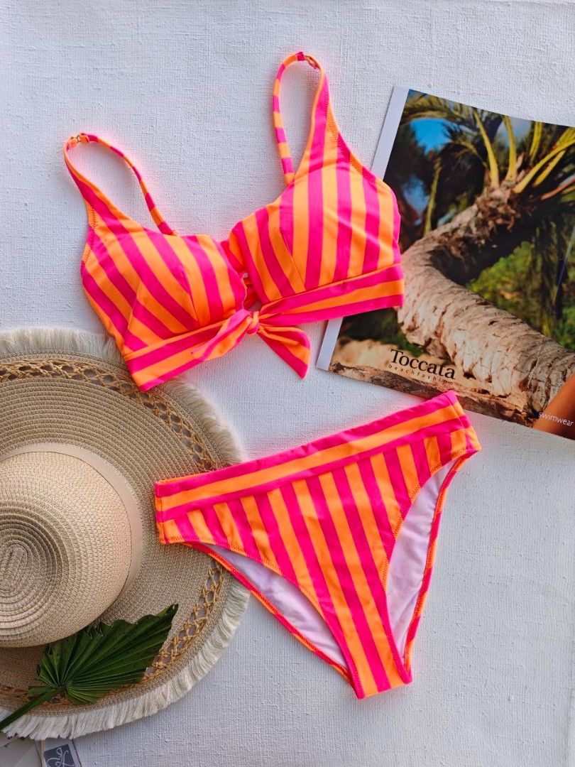 Роздільний купальник Toccata у смужку. У складі поліамід й еластан. Матеріал відрізняється еластичністю, м'якістю та стійкістю до впливу сонця і морської води, забезпечуючи тривалий термін служби й збереження яскравості відтінків.