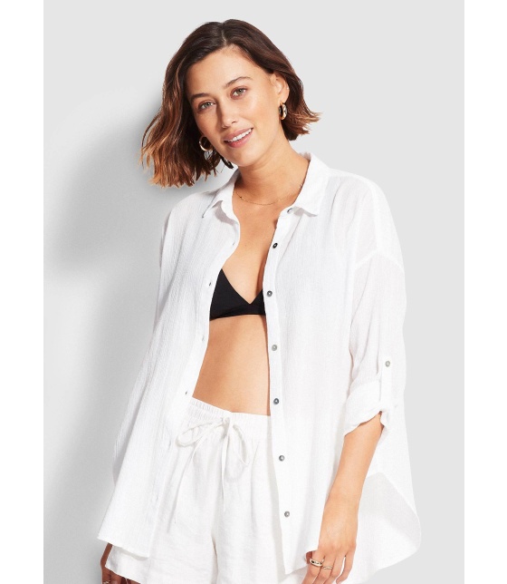 Коротка сорочка з бавовни – базова модель колекції австралійського бренду Seafolly. Сорочку можна носити на пляж або комбінувати у повсякденні цибулі із шортами, брюками, спідницями. Спереду та ззаду гудзики. Комірець стійка. З боків є розрізи. Рукав 3/4 з відворотом, призбираний та зафіксований ремінцем.