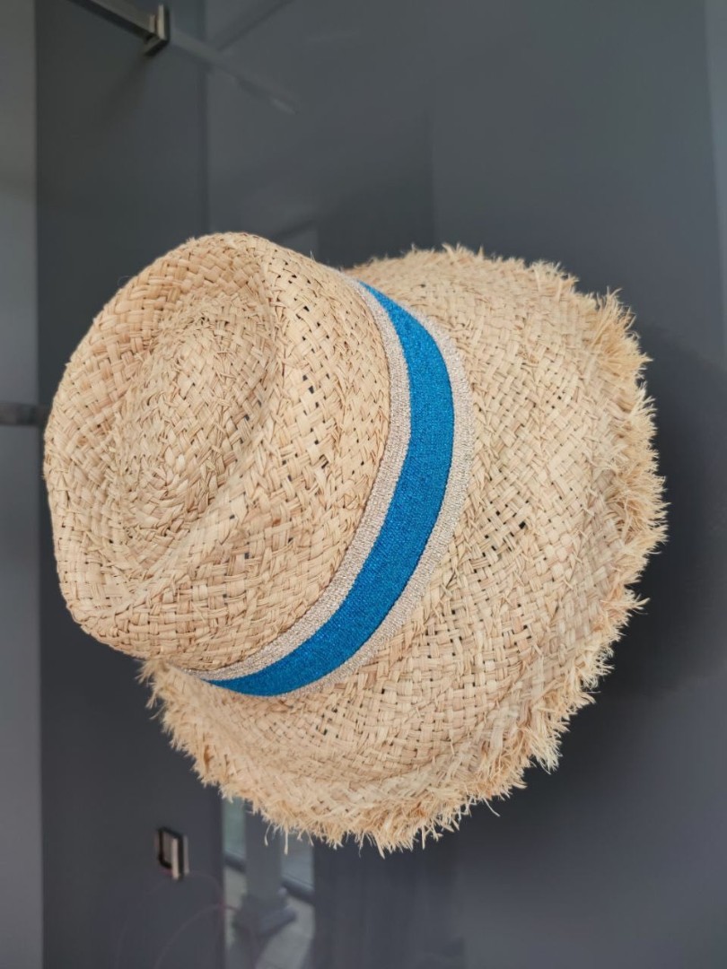 Капелюх солом'яний з фурнітурою від італійського преміум бренду PHO. Модель декорована контрастною блакитною стрічкою навколо тулії.