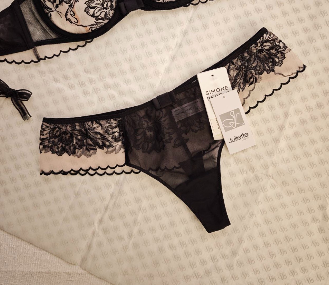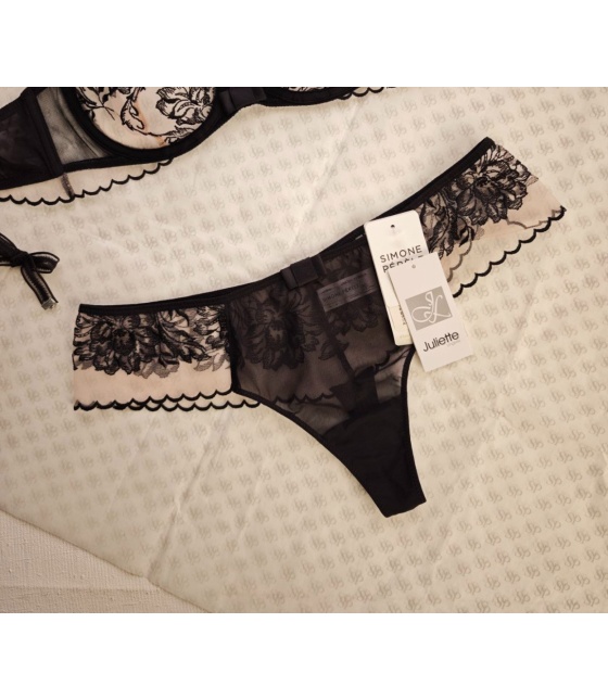 Трусики стрінги із колекції Romance французького бренду Simone Perele. Виконані у глибокому чорному кольорі з вишуканими вставками із тілесного тюлю. Головний акцент - ніжна квіткова вишивка на прозорому тюлі. Особливості моделі:
