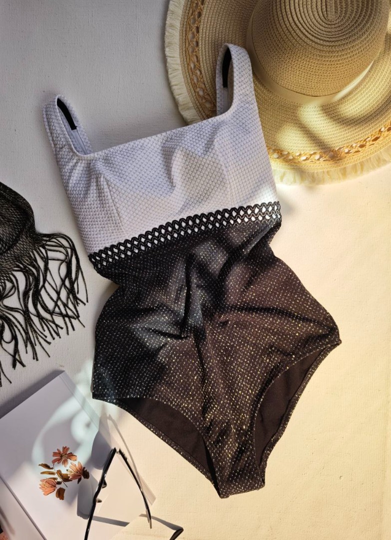 Суцільний купальник від німецького бренду Toccata, що поєднує молочну і чорну тканину, доповнену золотистою ниткою. Фактурний матеріал не лише виглядає дорого, а й приємно відчувається на тілі. Особливості моделі:
